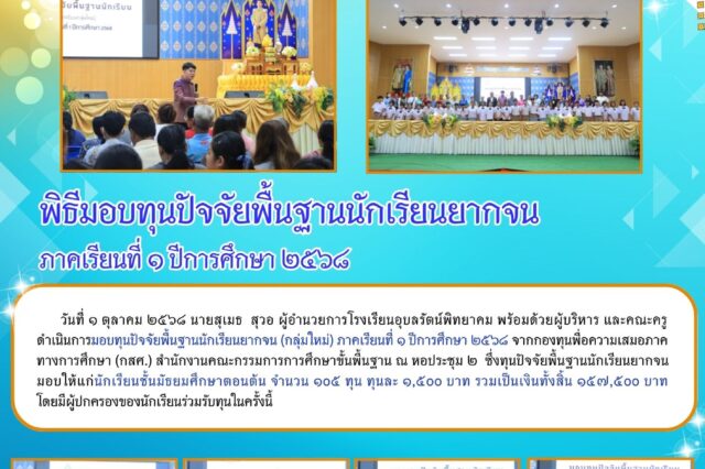 วันที่ ๑ ตุลาคม ๒๕๖๘ นายสุเมธ สุวอ ผู้อำนวยการโรงเรียนอุบลรัตน์พิทยาคม พร้อมด้วยผู้บริหาร และคณะครูดำเนินการมอบทุนปัจจัยพื้นฐานนักเรียนยากจน (กลุ่มใหม่) ภาคเรียนที่ ๑ ปีการศึกษา ๒๕๖๘ จากกองทุนพื่อความเสมอภาคทางการศึกษา (กสศ.) สำนักงานคณะกรรมการการศึกษาขั้นพื้นฐาน ณ หอประชุม…