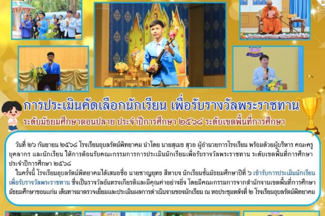 วันที่ ๒๖ กันยายน ๒๕๖๘ โรงเรียนอุบลรัตน์พิทยาคม นำโดย นายสุเมธ สุวอ ผู้อำนวยการโรงเรียน พร้อมด้วยผู้บริหาร คณะครูบุคลากร และนักเรียน ให้การต้อนรับคณะกรรมการการประเมินนักเรียนเพื่อรับรางวัลพระราชทาน ระดับเขตพื้นที่การศึกษา ประจำปีการศึกษา ๒๕๖๘ ในครั้งนี้ โรงเรียนอุบลรัตน์พิทยาคมได้เสนอชื่อ นายชาญยุทธ…