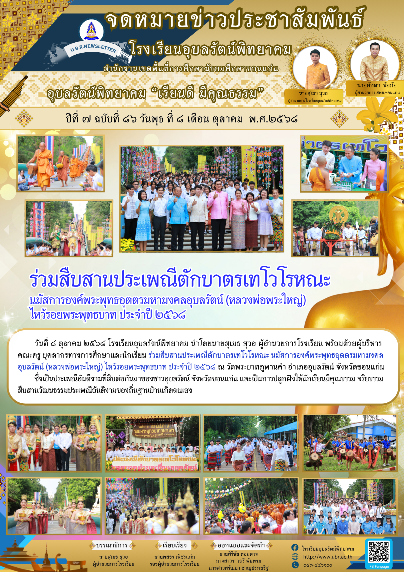 วันที่ ๘ ตุลาคม ๒๕๖๘ โรงเรียนอุบลรัตน์พิทยาคม นำโดยนายสุเมธ สุวอ ผู้อำนวยการโรงเรียน พร้อมด้วยผู้บริหาร คณะครู บุคลากรทางการศึกษาและนักเรียน ร่วมสืบสานประเพณีตักบาตรเทโวโรหณะ นมัสการองค์พระพุทธอุตตรมหามงคลอุบลรัตน์ (หลวงพ่อพระใหญ่) ไหว้รอยพระพุทธบาท ประจำปี ๒๕๖๘ ณ วัดพระบาทภูพานคำ อำเภออุบลรัตน์ จังหวัดขอนแก่น ซึ่งเป็นประเพณีอันดีงามที่สืบต่อกันมาของชาวอุบลรัตน์ จังหวัดขอนแก่น และเป็นการปลูกฝังให้นักเรียนมีคุณธรรม จริยธรรมสืบสานวัฒนธรรมประเพณีอันดีงามของถิ่นฐานบ้านเกิดตนเอง