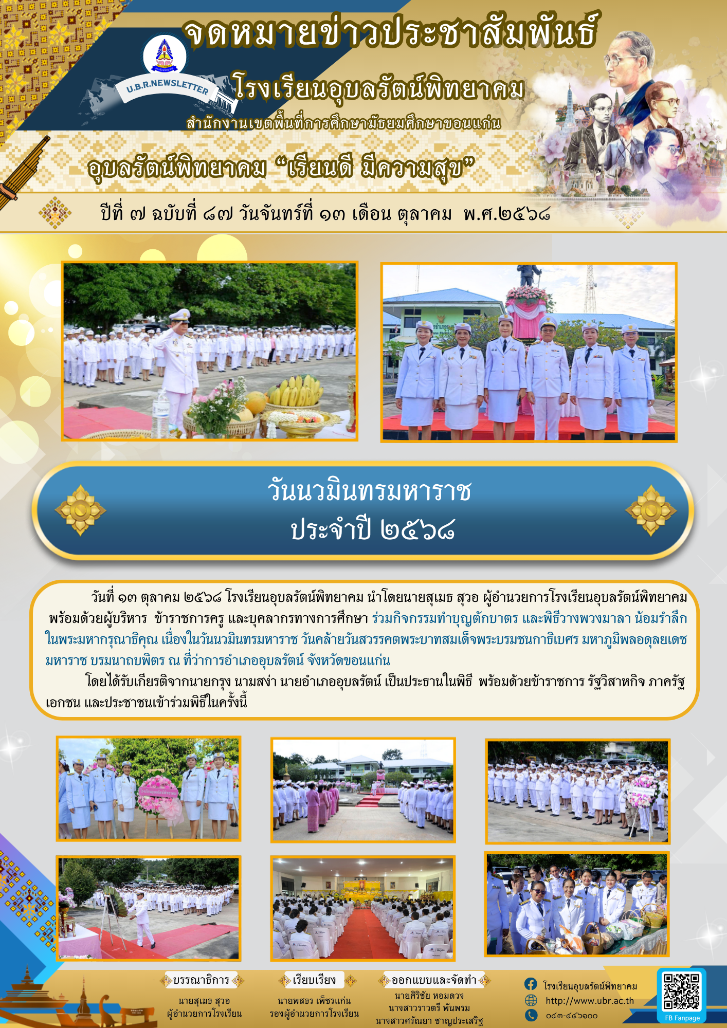 วันที่ ๑๓ ตุลาคม ๒๕๖๘ โรงเรียนอุบลรัตน์พิทยาคม นำโดยนายสุเมธ สุวอ ผู้อำนวยการโรงเรียนอุบลรัตน์พิทยาคม พร้อมด้วยผู้บริหาร ข้าราชการครู และบุคลากรทางการศึกษา ร่วมกิจกรรมทำบุญตักบาตร และพิธีวางพวงมาลา น้อมรำลึก ในพระมหากรุณาธิคุณ เนื่องในวันนวมินทรมหาราช วันคล้ายวันสวรรคตพระบาทสมเด็จพระบรมชนกาธิเบศร มหาภูมิพลอดุลยเดช มหาราช บรมนาถบพิตร ณ ที่ว่าการอำเภออุบลรัตน์ จังหวัดขอนแก่น โดยได้รับเกียรติจากนายกรุง นามสง่า นายอำเภออุบลรัตน์ เป็นประธานในพิธี พร้อมด้วยข้าราชการ รัฐวิสาหกิจ ภาครัฐ เอกชน และประชาชนเข้าร่วมพิธีในครั้งนี้