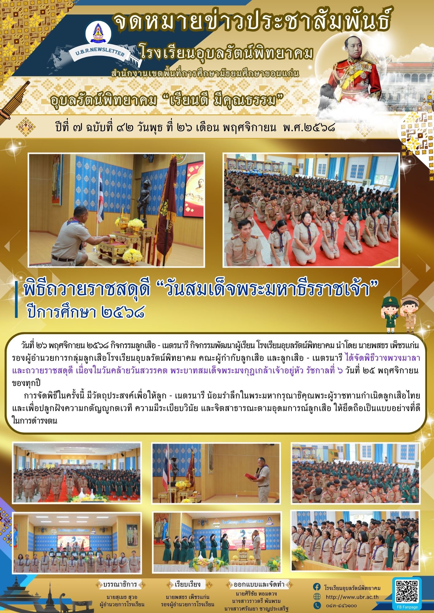 วันที่ ๒๖ พฤศจิกายน ๒๕๖๘ กิจกรรมลูกเสือ – เนตรนารี กิจกรรมพัฒนาผู้เรียน โรงเรียนอุบลรัตน์พิทยาคม นำโดย นายพสธร เพ็ชรแก่น รองผู้อำนวยการกลุ่มลูกเสือโรงเรียนอุบลรัตน์พิทยาคม คณะผู้กำกับลูกเสือ และลูกเสือ – เนตรนารี ได้จัดพิธีวางพวงมาลา และถวายราชสดุดี เนื่องในวันคล้ายวันสวรรคต พระบาทสมเด็จพระมงกุฎเกล้าเจ้าอยู่หัว รัชกาลที่ ๖วันที่ ๒๕ พฤศจิกายนของทุกปี การจัดพิธีในครั้งนี้ มีวัตถุประสงค์เพื่อให้ลูก – เนตรนารี น้อมรำลึกในพระมหากรุณาธิคุณพระผู้ราชทานกำเนิดลูกเสือไทยและเพื่อปลูกฝังความกตัญญูกตเวที ความมีระเบียบวินัย และจิตสาธารณะตามอุดมการณ์ลูกเสือ ให้ยึดถือเป็นแบบอย่างที่ดีในการดำรงตน