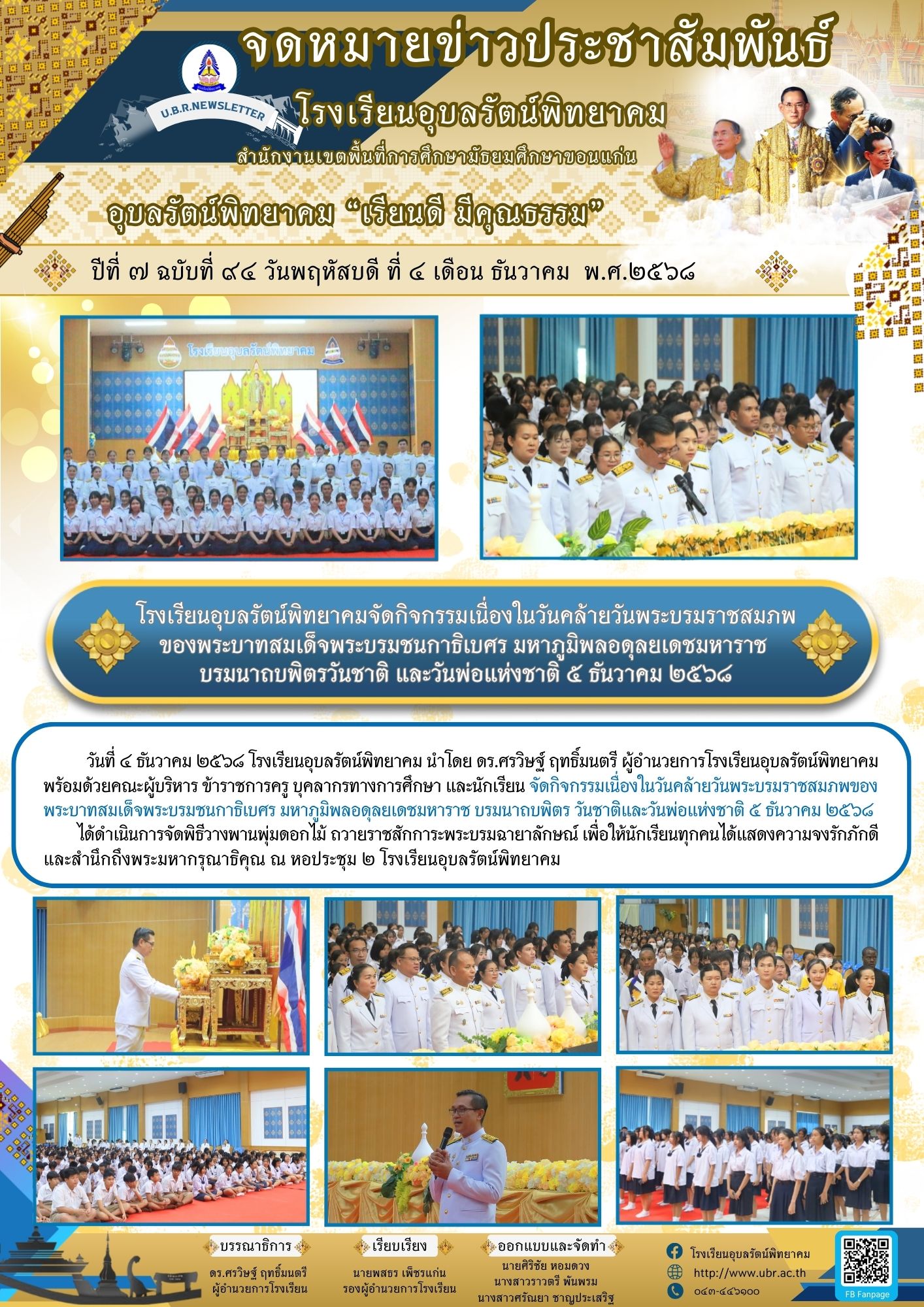 วันที่ ๔ ธันวาคม ๒๕๖๘ โรงเรียนอุบลรัตน์พิทยาคม นำโดย ดร.ศรวิษฐ์ ฤทธิ์มนตรี ผู้อำนวยการโรงเรียนอุบลรัตน์พิทยาคม พร้อมด้วยคณะผู้บริหาร ข้าราชการครู บุคลากรทางการศึกษา และนักเรียน จัดกิจกรรมเนื่องในวันคล้ายวันพระบรมราชสมภพของพระบาทสมเด็จพระบรมชนกาธิเบศร มหาภูมิพลอดุลยเดชมหาราช บรมนาถบพิตร วันชาติและวันพ่อแห่งชาติ ๕ ธันวาคม ๒๕๖๘ ได้ดำเนินการจัดพิธีวางพานพุ่มดอกไม้ ถวายราชสักการะพระบรมฉายาลักษณ์ เพื่อให้นักเรียนทุกคนได้แสดงความจงรักภักดี และสำนึกถึงพระมหากรุณาธิคุณ ณ หอประชุม ๒ โรงเรียนอุบลรัตน์พิทยาคม