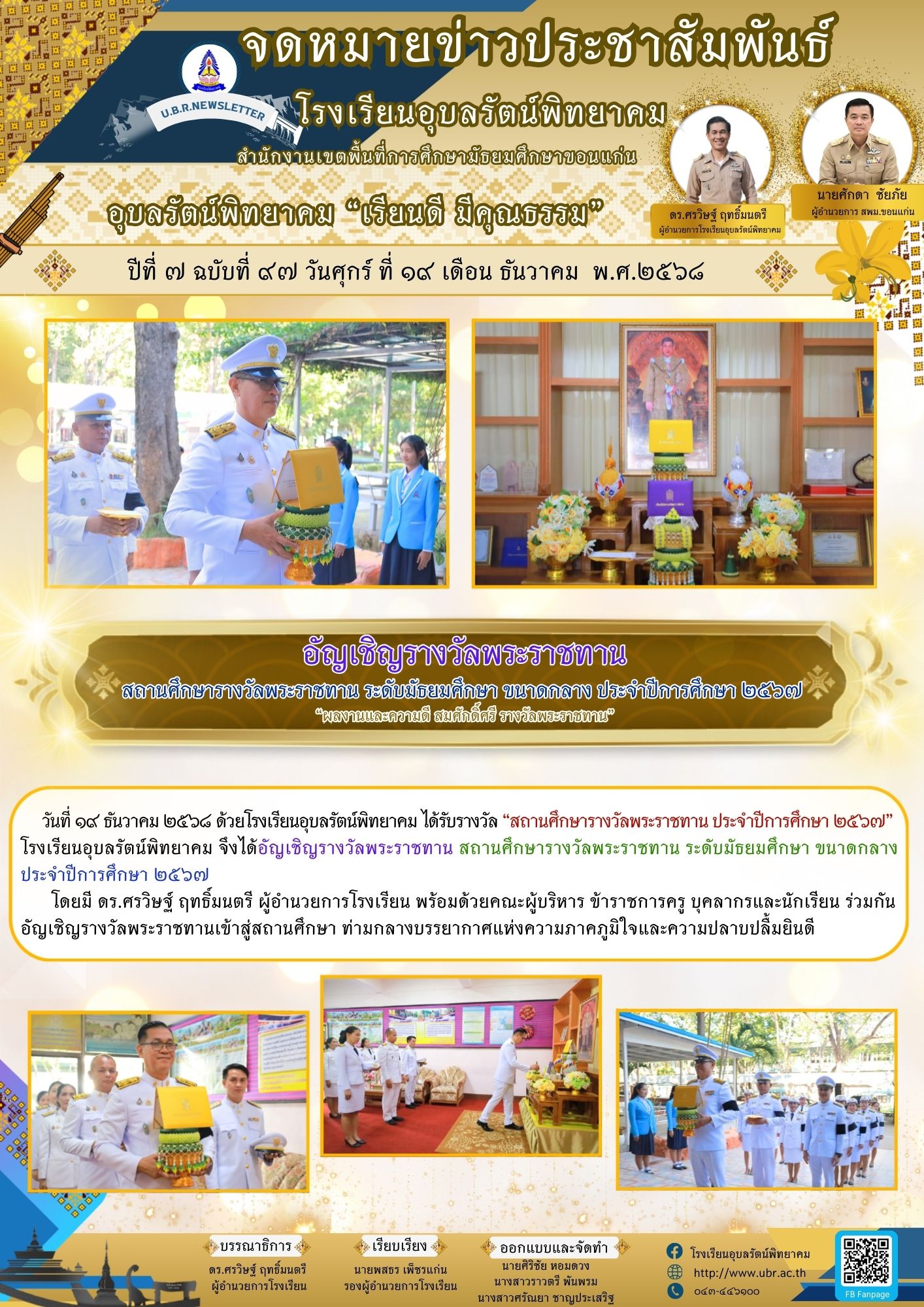 วันที่ ๑๙ ธันวาคม ๒๕๖๘ ด้วยโรงเรียนอุบลรัตน์พิทยาคม ได้รับรางวัล “สถานศึกษารางวัลพระราชทาน ประจำปีการศึกษา ๒๕๖๗” โรงเรียนอุบลรัตน์พิทยาคม จึงได้อัญเชิญรางวัลพระราชทานสถานศึกษารางวัลพระราชทาน ระดับมัธยมศึกษา ขนาดกลาง ประจำปีการศึกษา ๒๕๖๗ โดยมี ดร.ศรวิษฐ์ ฤทธิ์มนตรี ผู้อำนวยการโรงเรียน พร้อมด้วยคณะผู้บริหาร ข้าราชการครู บุคลากรและนักเรียน ร่วมกันอัญเชิญรางวัลพระราชทานเข้าสู่สถานศึกษา ท่ามกลางบรรยากาศแห่งความภาคภูมิใจและความปลาบปลื้มยินดี