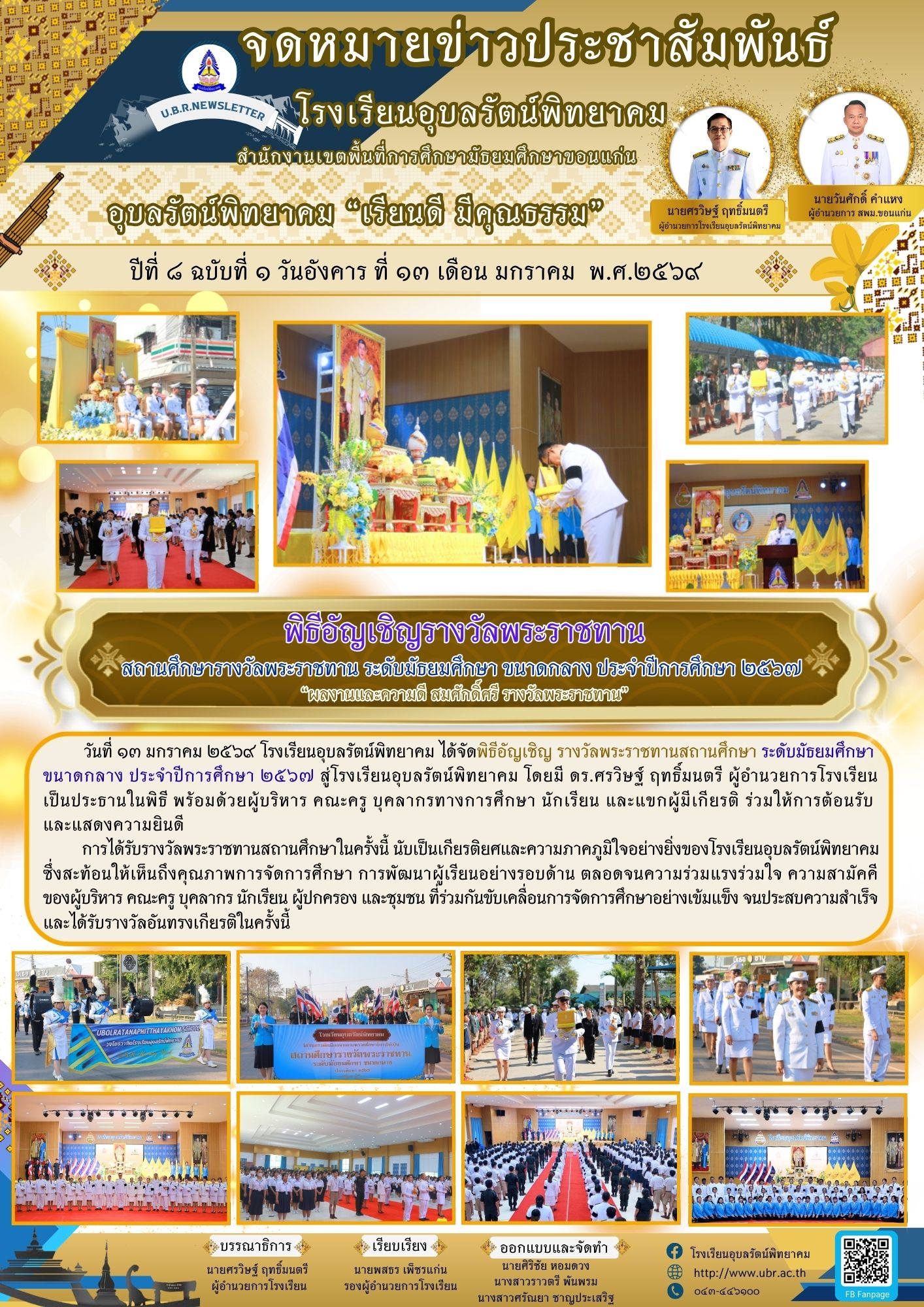 สถานศึกษารางวัลพระราชทาน ระดับมัธยมศึกษา ขนาดกลาง ประจำปีการศึกษา ๒๕๖๗ “ผลงานและความดี สมศักดิ์ศรี รางวัลพระราชทาน” วันที่ ๑๓ มกราคม ๒๕๖๙ โรงเรียนอุบลรัตน์พิทยาคม ได้จัดพิธีอัญเชิญ รางวัลพระราชทานสถานศึกษาระดับมัธยมศึกษาขนาดกลาง ประจำปีการศึกษา ๒๕๖๗สู่โรงเรียนอุบลรัตน์พิทยาคม โดยมี ดร.ศรวิษฐ์ ฤทธิ์มนตรี ผู้อำนวยการโรงเรียนเป็นประธานในพิธี พร้อมด้วยผู้บริหาร คณะครู บุคลากรทางการศึกษา นักเรียน และแขกผู้มีเกียรติ ร่วมให้การต้อนรับ และแสดงความยินดีการได้รับรางวัลพระราชทานสถานศึกษาในครั้งนี้ นับเป็นเกียรติยศและความภาคภูมิใจอย่างยิ่งของโรงเรียนอุบลรัตน์พิทยาคม ซึ่งสะท้อนให้เห็นถึงคุณภาพการจัดการศึกษา การพัฒนาผู้เรียนอย่างรอบด้าน ตลอดจนความร่วมแรงร่วมใจ ความสามัคคี ของผู้บริหาร คณะครู บุคลากร นักเรียน ผู้ปกครอง และชุมชน ที่ร่วมกันขับเคลื่อนการจัดการศึกษาอย่างเข้มแข็ง จนประสบความสำเร็จ และได้รับรางวัลอันทรงเกียรติในครั้งนี้