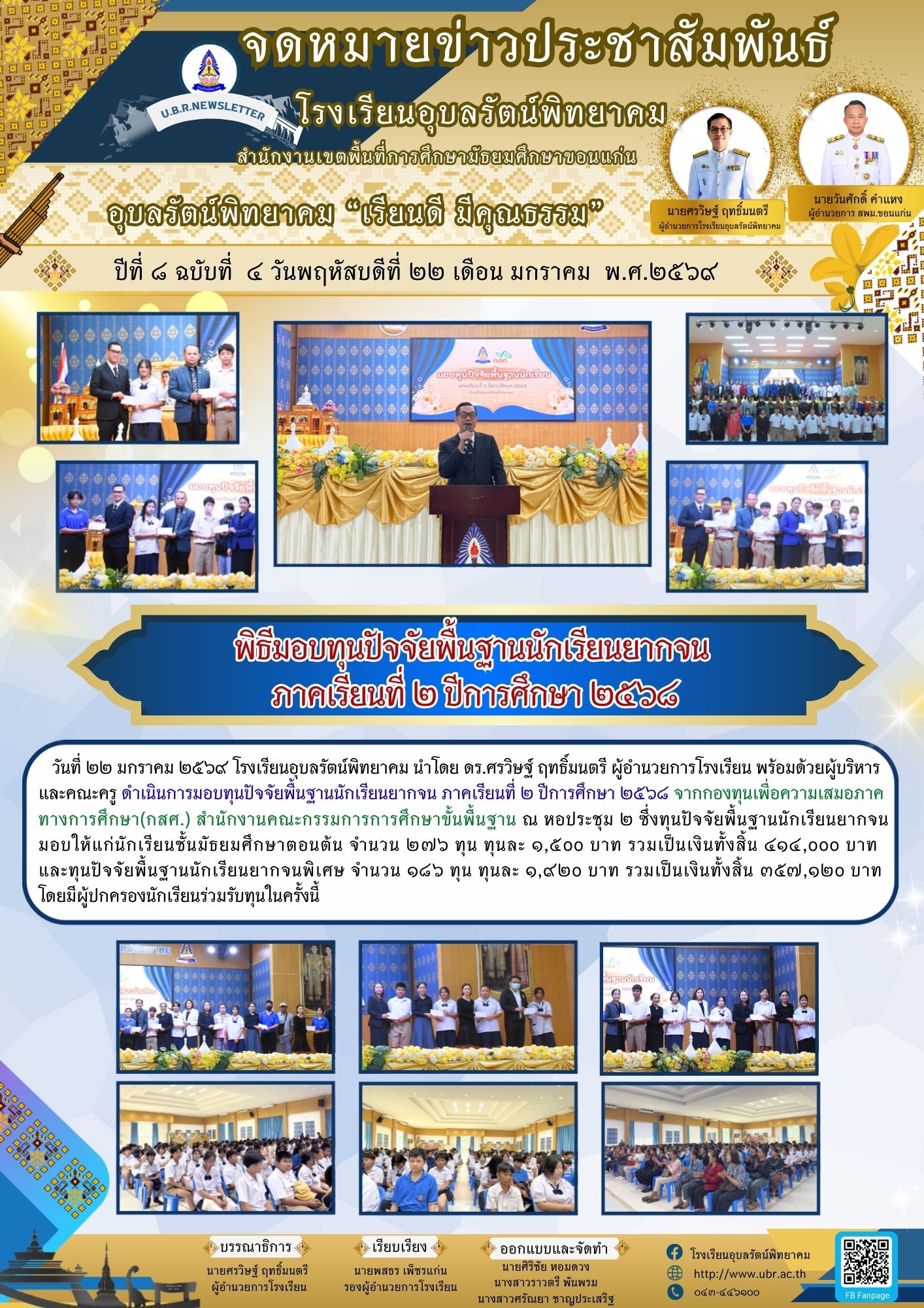 วันที่ ๒๒ มกราคม ๒๕๖๙ โรงเรียนอุบลรัตน์พิทยาคม นำโดย ดร.ศรวิษฐ์ ฤทธิ์มนตรี ผู้อำนวยการโรงเรียน พร้อมด้วยผู้บริหาร และคณะครู ดำเนินการมอบทุนปัจจัยพื้นฐานนักเรียนยากจน ภาคเรียนที่ ๒ ปีการศึกษา ๒๕๖๘ จากกองทุนเพื่อความเสมอภาคทางการศึกษา(กสศ.) สำนักงานคณะกรรมการการศึกษาขั้นพื้นฐานณ หอประชุม ๒ ซึ่งทุนปัจจัยพื้นฐานนักเรียนยากจน มอบให้แก่นักเรียนชั้นมัธยมศึกษาตอนต้น จำนวน ๒๗๖ ทุน ทุนละ ๑,๕oo บาท รวมเป็นเงินทั้งสิ้น ๔๑๔,ooo บาท และทุนปัจจัยพื้นฐานนักเรียนยากจนพิเศษ จำนวน ๑๘๖ ทุน ทุนละ ๑,๙๒o บาท รวมเป็นเงินทั้งสิ้น ๓๕๗,๑๒o บาท โดยมีผู้ปกครองนักเรียนร่วมรับทุนในครั้งนี้