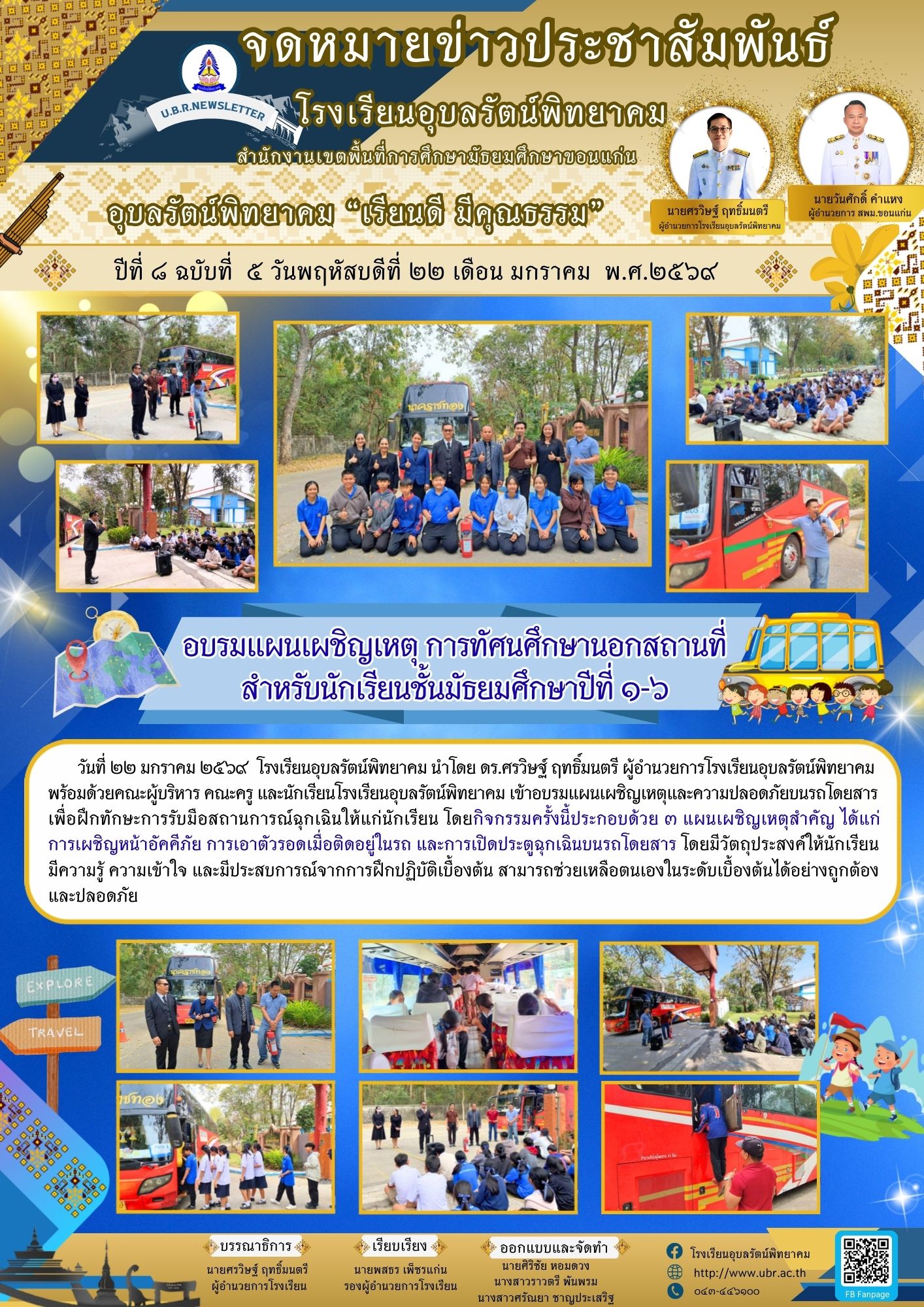 วันที่ ๒๒ มกราคม ๒๕๖๙ โรงเรียนอุบลรัตน์พิทยาคม นำโดย ดร.ศรวิษฐ์ ฤทธิ์มนตรี ผู้อำนวยการโรงเรียนอุบลรัตน์พิทยาคม พร้อมด้วยคณะผู้บริหาร คณะครู และนักเรียนโรงเรียนอุบลรัตน์พิทยาคม เข้าอบรมแผนเผชิญเหตุและความปลอดภัยบนรถโดยสาร เพื่อฝึกทักษะการรับมือสถานการณ์ฉุกเฉินให้แก่นักเรียน โดยกิจกรรมครั้งนี้ประกอบด้วย ๓ แผนเผชิญเหตุสำคัญ ได้แก่ การเผชิญหน้าอัคคีภัย การเอาตัวรอดเมื่อติดอยู่ในรถ และการเปิดประตูฉุกเฉินบนรถโดยสารโดยมีวัตถุประสงค์ให้นักเรียน มีความรู้ ความเข้าใจ และมีประสบการณ์จากการฝึกปฏิบัติเบื้องต้น สามารถช่วยเหลือตนเองในระดับเบื้องต้นได้อย่างถูกต้องและปลอดภัย