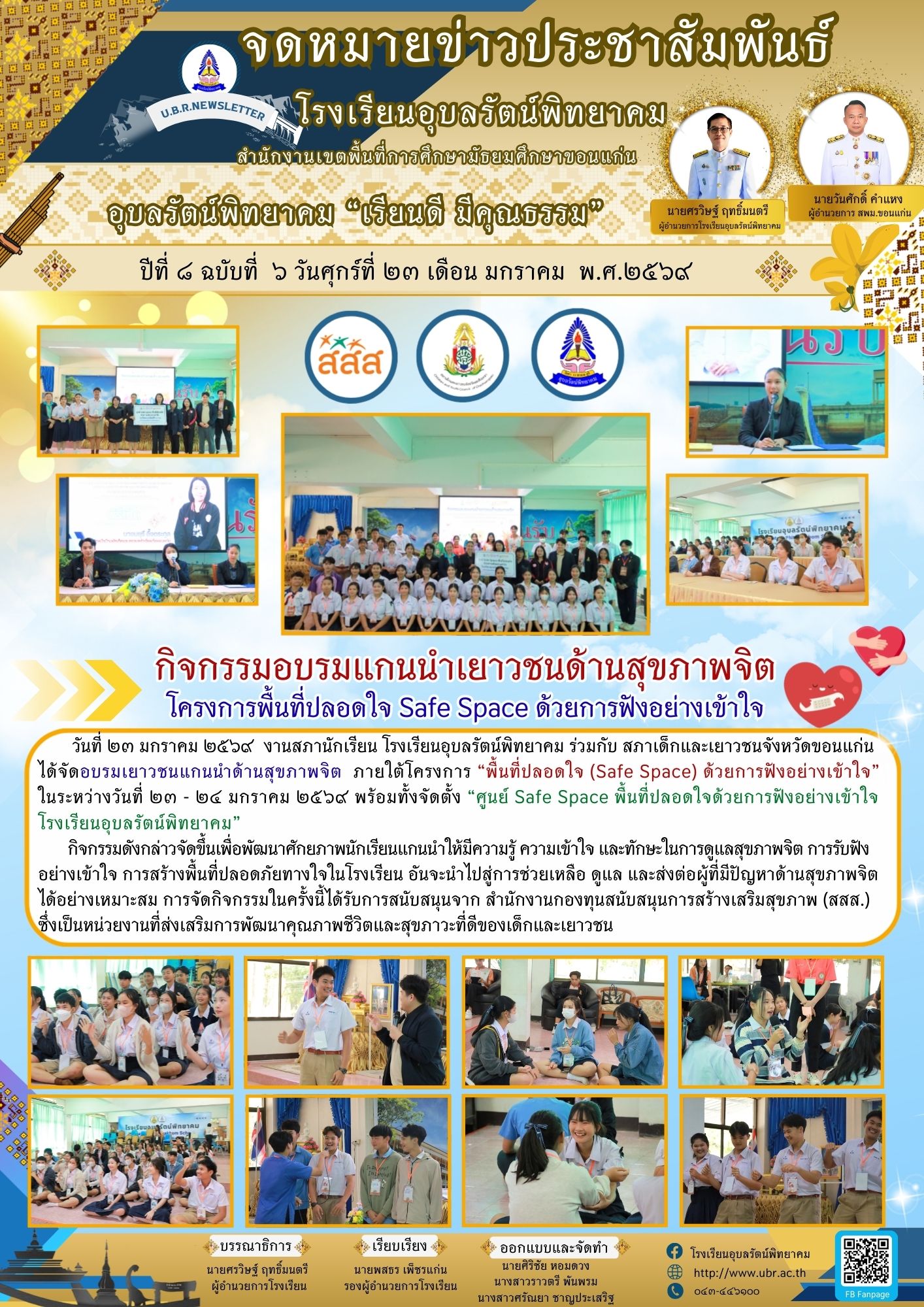 วันที่ ๒๓ มกราคม ๒๕๖๙ งานสภานักเรียน โรงเรียนอุบลรัตน์พิทยาคม ร่วมกับ สภาเด็กและเยาวชนจังหวัดขอนแก่น ได้จัดอบรมเยาวชนแกนนำด้านสุขภาพจิตภายใต้โครงการ “พื้นที่ปลอดใจ (Safe Space) ด้วยการฟังอย่างเข้าใจ” ในระหว่างวันที่ ๒๓ – ๒๔ มกราคม ๒๕๖๙ พร้อมทั้งจัดตั้ง “ศูนย์ Safe Space พื้นที่ปลอดใจด้วยการฟังอย่างเข้าใจ โรงเรียนอุบลรัตน์พิทยาคม” กิจกรรมดังกล่าวจัดขึ้นเพื่อพัฒนาศักยภาพนักเรียนแกนนำให้มีความรู้ ความเข้าใจ และทักษะในการดูแลสุขภาพจิต การรับฟัง อย่างเข้าใจ การสร้างพื้นที่ปลอดภัยทางใจในโรงเรียน อันจะนำไปสู่การช่วยเหลือ ดูแล และส่งต่อผู้ที่มีปัญหาด้านสุขภาพจิตได้อย่างเหมาะสม การจัดกิจกรรมในครั้งนี้ได้รับการสนับสนุนจาก สำนักงานกองทุนสนับสนุนการสร้างเสริมสุขภาพ (สสส.) ซึ่งเป็นหน่วยงานที่ส่งเสริมการพัฒนาคุณภาพชีวิตและสุขภาวะที่ดีของเด็กและเยาวชน