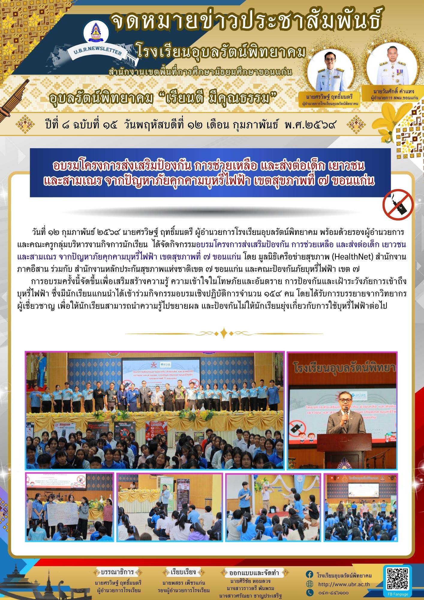 วันที่ ๑๒ กุมภาพันธ์ ๒๕๖๙ นายศรวิษฐ์ ฤทธิ์มนตรี ผู้อำนวยการโรงเรียนอุบลรัตน์พิทยาคม พร้อมด้วยรองผู้อำนวยการและคณะครูกลุ่มบริหารงานกิจการนักเรียนได้จัดกิจกรรมอบรมโครงการส่งเสริมป้องกัน การช่วยเหลือ และส่งต่อเด็ก เยาวชน และสามเณร จากปัญหาภัยคุกคามบุหรี่ไฟฟ้า เขตสุขภาพที่ ๗ ขอนแก่น โดย มูลนิธิเครือข่ายสุขภาพ (HealthNet) สำนักงานภาคอีสาน ร่วมกับ สำนักงานหลักประกันสุขภาพแห่งชาติเขต ๗ ขอนแก่น และคณะป้องกันภัยบุหรี่ไฟฟ้า เขต ๗ การอบรมครั้งนี้จัดขึ้นเพื่อเสริมสร้างความรู้ ความเข้าใจในโทษภัยและอันตราย การป้องกันและเฝ้าระวังภัยการเข้าถึงบุหรี่ไฟฟ้า ซึ่งมีนักเรียนแกนนำได้เข้าร่วมกิจกรรมอบรมเชิงปฏิบัติการจำนวน ๑๕๙ คน โดยได้รับการบรรยายจากวิทยากรผู้เชี่ยวชาญ เพื่อให้นักเรียนสามารถนำความรู้ไปขยายผล และป้องกันไม่ให้นักเรียนยุ่งเกี่ยวกับการใช้บุหรี่ไฟฟ้าต่อไป